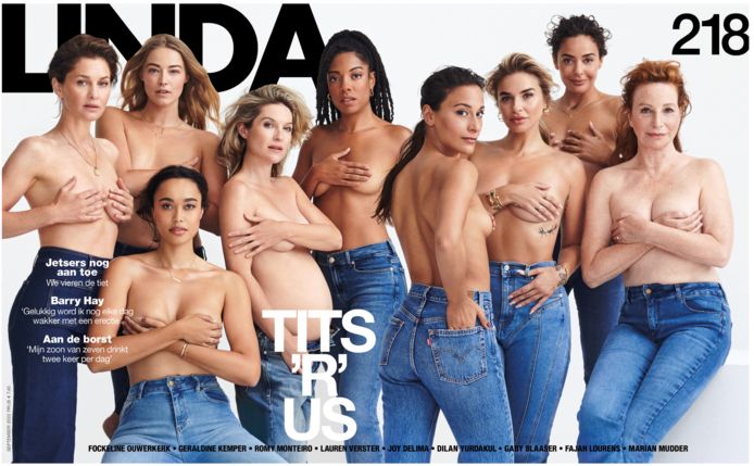 Geraldine Kemper apologizes for the new version of LindaBecause according to some readers it is not comprehensive enough. For the cover, Fouclin Owerkirk, Geraldine Kemper, Joey D’Alema, Romy Monteiro, Marianne Mader, Fajah Lorenz, Dylan Yurdakul, Lorraine Verster, and Gabi Blaser stripped down their clothing to advocate for the normalization of women’s breasts.